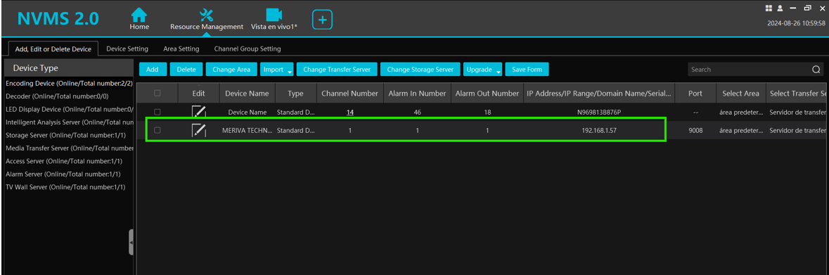 Una vez añadida debemos validar que el servidor de inteligencia este en Línea, es en el mismo apartado donde agregamos los dispositivos, viene un apartado llamado “Intelligent Analysis Server” este mismo es un servicio del software que permite jalar u obtener datos de las analíticas de los puntos de monitoreo (cámaras o NVR).