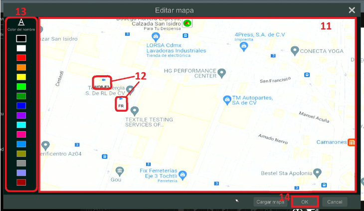 Se cerrará la ventana y nos aparecerá el mapa cargado (11), movemos las cámaras del grabador (12) (que cuentan con el reconocimiento facial) en el sitio deseado o donde se encuentren (en la parte de la izquierda podemos cambiar el color del nombre si lo desea (13)), al terminar presionamos el botón OK (14) para que nuestro mapa quede guardado.