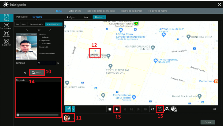 Se cerrará la ventana y nos mostrará la imagen que seleccionamos y presionamos el botón Busq (10), una vez realizada la búsqueda nos aparecerá el registro de la persona buscada (11) en la parte de abajo, nos mostrará la(s) cámara(s) (12) que detectaron el usuario y podemos reproducir (13) el clip tomado que se visualizara en la parte de abajo del botón de Busq en Reprodu. (14) y podemos seleccionar si queremos que muestre el trayecto (15) de acuerdo a las cámaras detectadas.