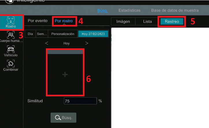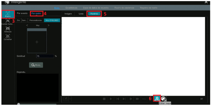 Nos aparecerá unos apartados en donde seleccionamos Rostro (3) > Por rostro (4) > Rastreo (5) y seleccionamos el icono del mapa (6).