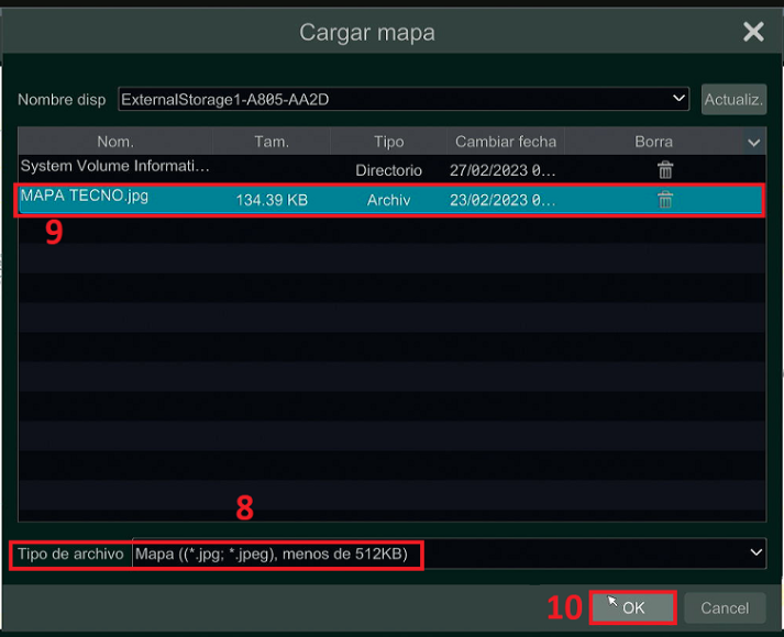 Nos mostrará otra ventana para cargar el mapa, (el mapa a cargar es una imagen que tiene que estar en formato jpg o jpeg (8) y debe pesar menos de 512KB en una USB formato FAT32) una vez teniendo el mapa en la USB seleccionamos la imagen (9) y le damos en OK (10).