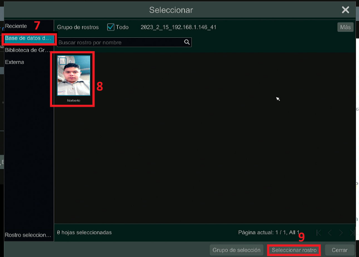 Aparecerá una ventana en la cual seleccionaremos la persona que deseamos buscar en las cámaras permitidas encontrada en nuestra base de datos (8), seleccionamos el rostro (8) y pulsamos el botón Seleccionar rostro (9).