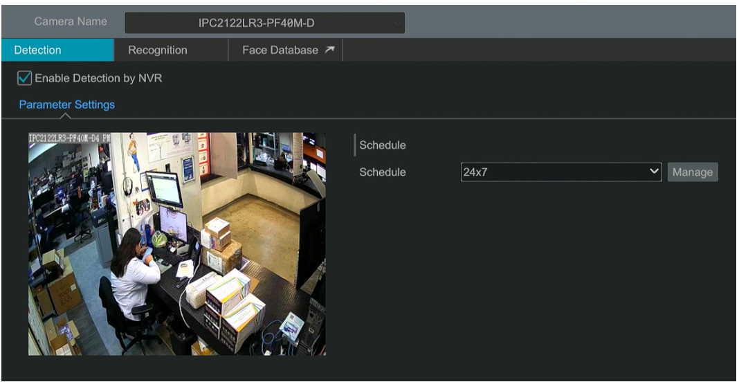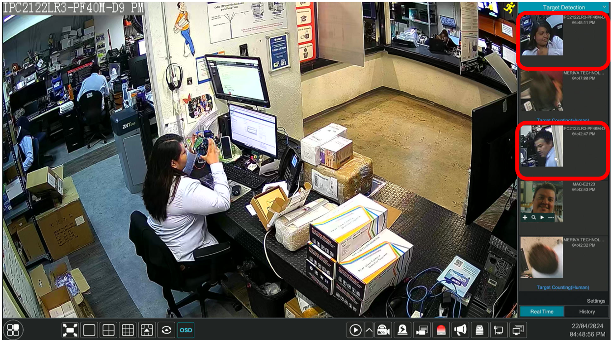 Como se ve en la imagen anterior se tienen una cámara UNV con detección facial, realizando la tarea el NVR. Al ser detectado un rostro se mostrará en la vista en vivo con la vista inteligente.
