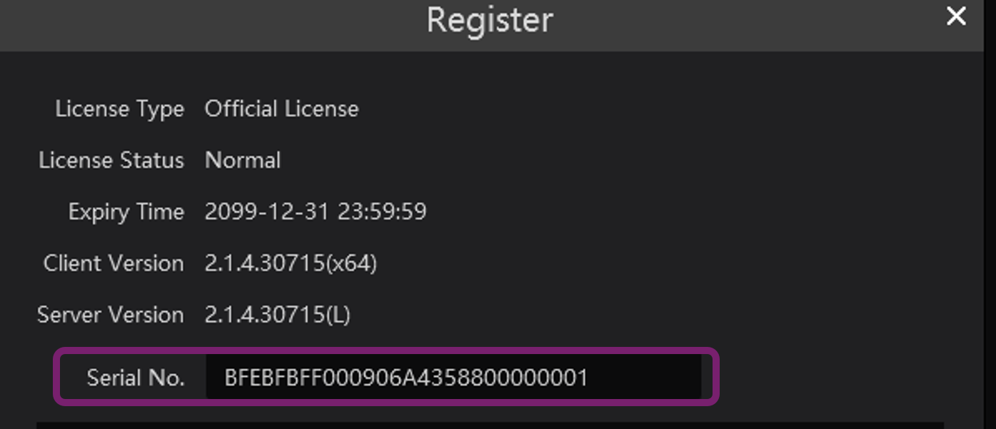 Es necesario ingresar al software cliente “Monitor Client” y seleccionar el icono, el cual se encuentra en la parte superior derecha del software y dando clic en la opción “Registro” y mostrara la serie.