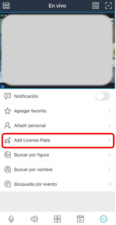 2.- Ya en la vista en vivo, presionar el icono en la parte inferior derecha y abrirá un nuevo menú de opciones y debemos presionar “Add License Plate” como se muestra a continuación: