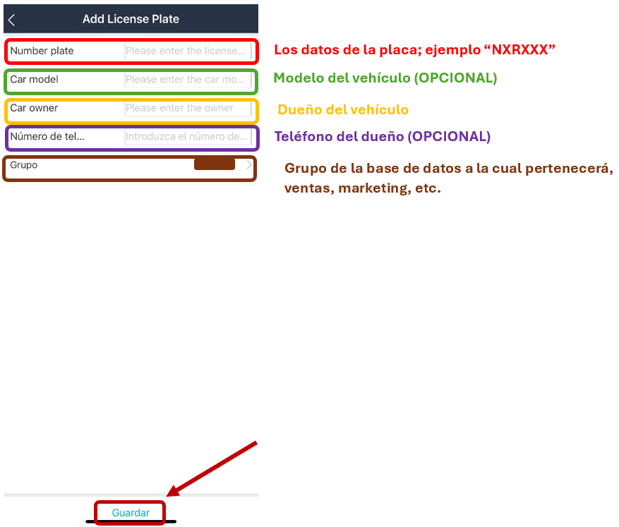 3.- Una vez presionado nos mostrará la siguiente ventana donde ingresaremos los datos de la placa y al terminar presionaremos Guardar.
