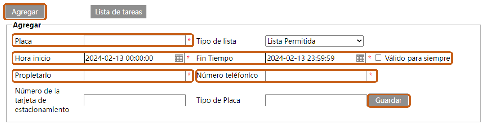 Tipo de lista (Lista blanca, Lista negra, Vehículos Desconocidos).