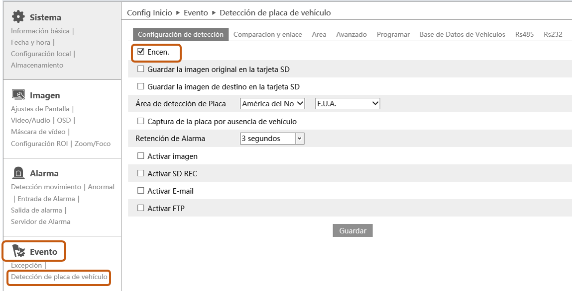 Configuración --> Evento --> Detección de placa de vehiculo --> Habilitar / Encender.
