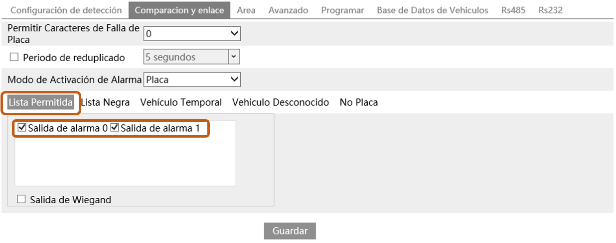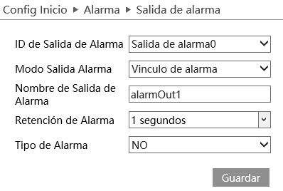 Es necesario revisar como están configuradas las salidas de alarma de la cámara, para que se vincule con la detección y reconocimiento de placas, es necesario dejarlo como "Enlace / Vinculo de alarma"