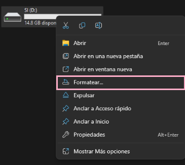 Daremos Clic derecho y seleccionaremos "Formatear".