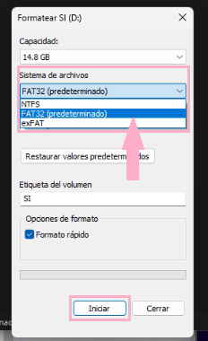Seleccione "FAT32" , "Formato rápido" e iniciar.