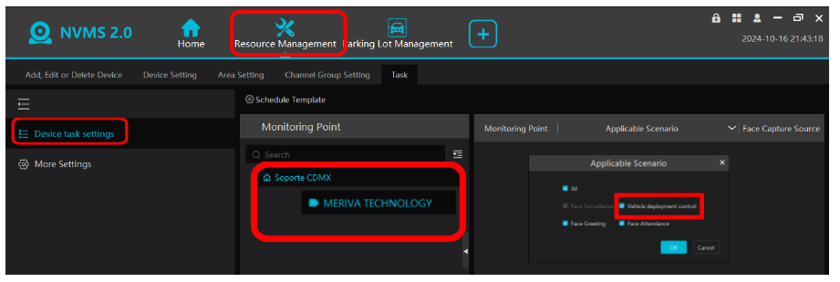 1.- Lo Primero que haremos es irnos a Gestión de recursos / Resource management → Configuración de tareas del Dispositivo / Device Task Settings ► Seleccionamos dentro de nuestra área el dispositivo, nos mostrara una ventana del lado de la derecha donde seleccionaremos Escenario Aplicable / Applicable Scenario. Nos mostrará una nueva ventana y seleccionaremos Control de despliegue de vehículos / Vehicle deployement control y confirmamos con "OK".