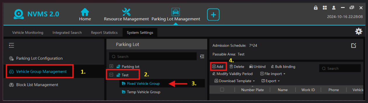 4. Dentro del mismo modulo, seleccionaremos Grupo de Vehiculos / Vehicle Group → Test (Estacionamiento previamente creado) → Grupo de Vehiculos Fijos / Fixed vehicle group → Agregamos / Add
