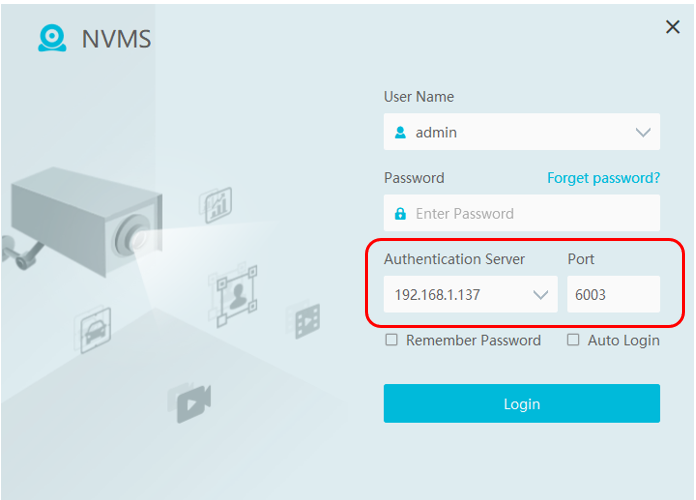 1.- Al ejecutar el software NVMS 2.0 Monitor Client, ver cuál es la dirección IP y puerto del servidor de autenticación (la dirección IP Local de la PC donde está instalada el software), ya que se ocuparán después.