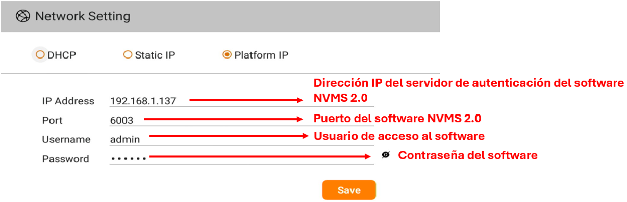 3.- Al entrar mostrara el apartado de Network Setting donde hay que validar que este por DHCP y seleccionar el apartado de Platform IP donde hay que colocar los siguientes datos: