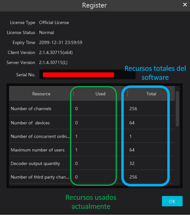 Sería muy tedioso ir contando cuantos canales de video IP (NVR/DVR/IPC) o decodificadores quedan disponibles, es por eso que se tiene un registro donde muestra al estilo de una tabla todos los recursos disponibles y los que actualmente se están usando en el software. Esta tabla es meramente informativa donde se puede comparar el espacio disponible.