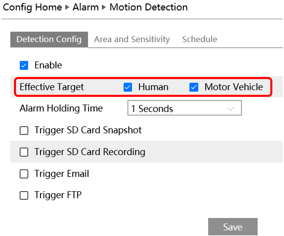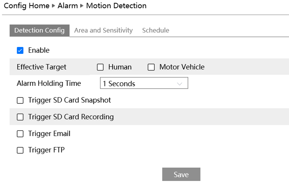 A diferencia de las analíticas inteligentes que se encuentran en el menú de “Event” para el SMD elegiremos el menú de “Alarm” y “Motion Detection” mostrara la siguiente ventana: