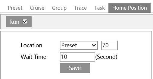 5.- Por último en este mismo apartado ir a Home Position, habilitar la opción de RUN y colocar el tiempo, recordando que este tiempo hace referencia a el tiempo que va a esperar la cámara para regresar a la posición home o inicial.