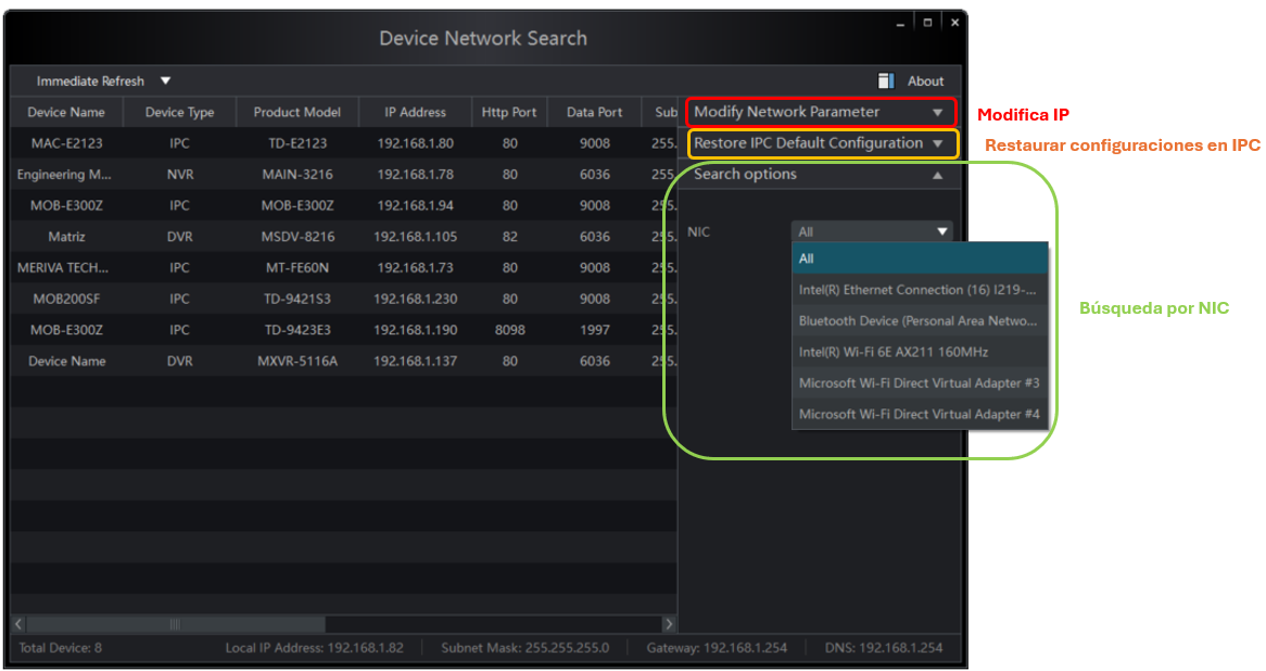 En la versión anterior, es decir, la 2.0 la herramienta soportaba además cambio de dirección IP de dispositivos y restauración de cámaras IP, en esta nueva versión no perdió estas cualidades y agrega una más la cual es “Search Options” lo cual permite realizar la búsqueda por algún NIC (tarjeta de interfaz de red) dentro de la computadora esto en el caso de se tenga más de una red.