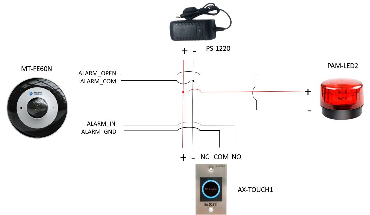 La cámara MT-FE60N cuenta con entrada y salida de alarma por medio de pulso seco, lo cual permite vincularse para al recibir una señal de entrada NA / NC (normalmente abierto/cerrado) se pueda activar la salida de alarma y así poder activar un estrobo, sirena o mandar una señal de pulso seco tambien.