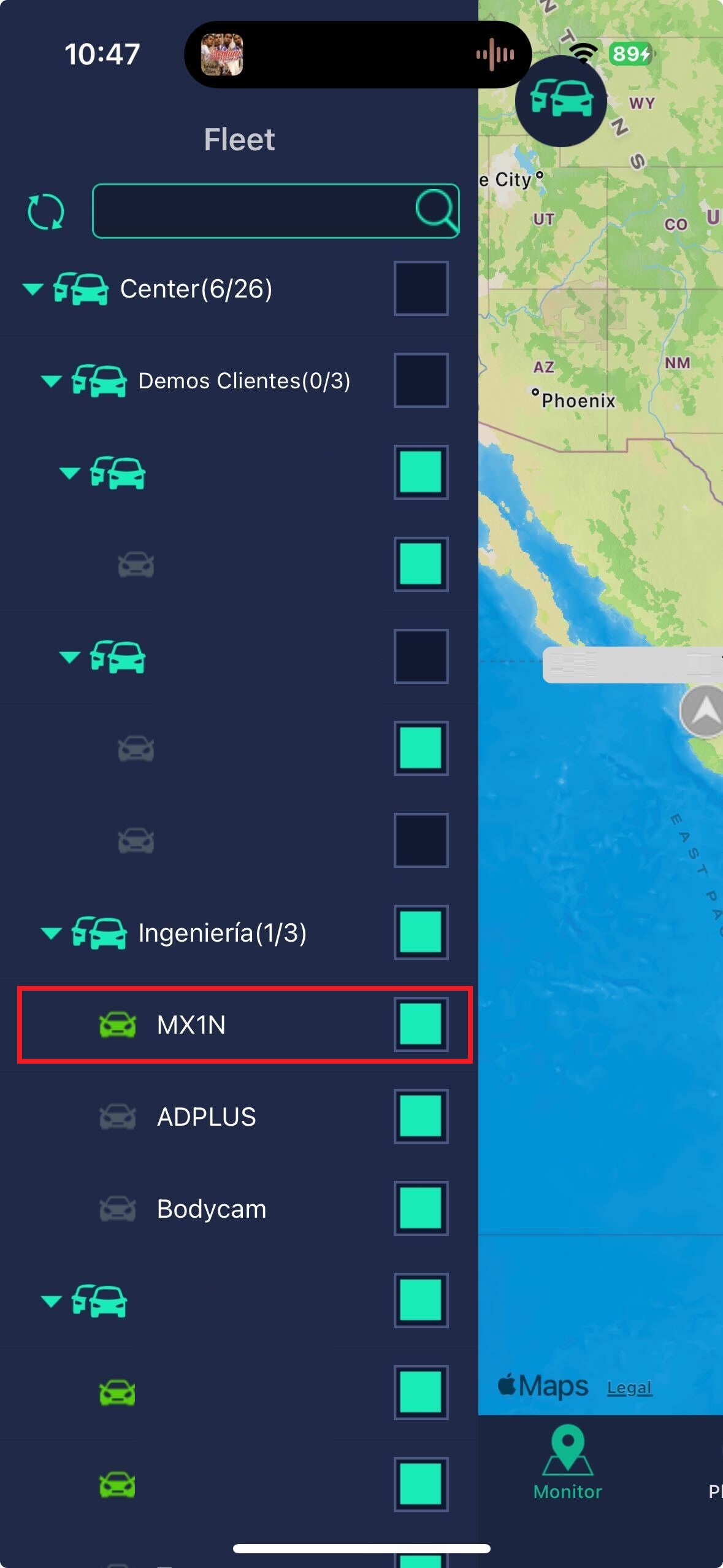 Tendremos que seleccionar el vehiculo el cuál queremos mandar el mensaje, para que esto pueda efectuarse tiene que ser un vehiculo encendido y conectado a la plataforma.