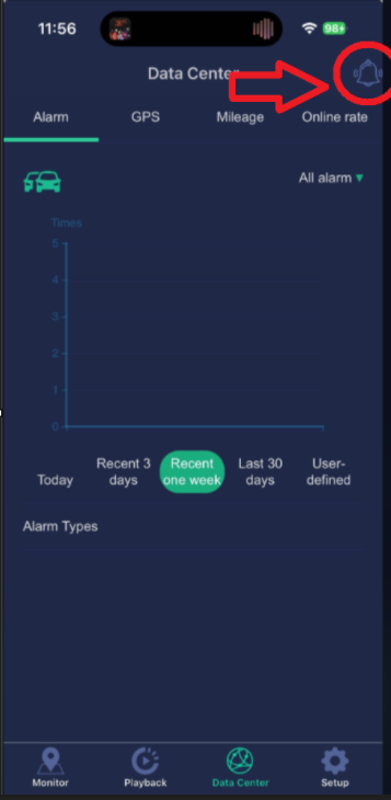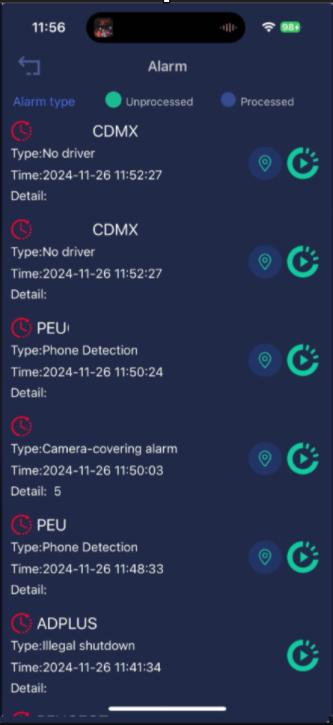 Una vez dentro de este menú podremos ver todas las notificaciones mas recientes así como el nombre del vehiculo y el tipo de alarma que fue detonada, la hora, el playback GPS y para ubicarlo en tiempo real.