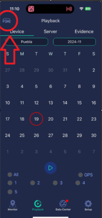Posteriormente tendremos que seleccionar un vehiculo que se encuentre encendido para poder visualizar las grabaciones.