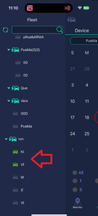 Paso siguiente será abrir la lista de dispositivos con el ícono de los vehiculos y seleccionada la opción de Device